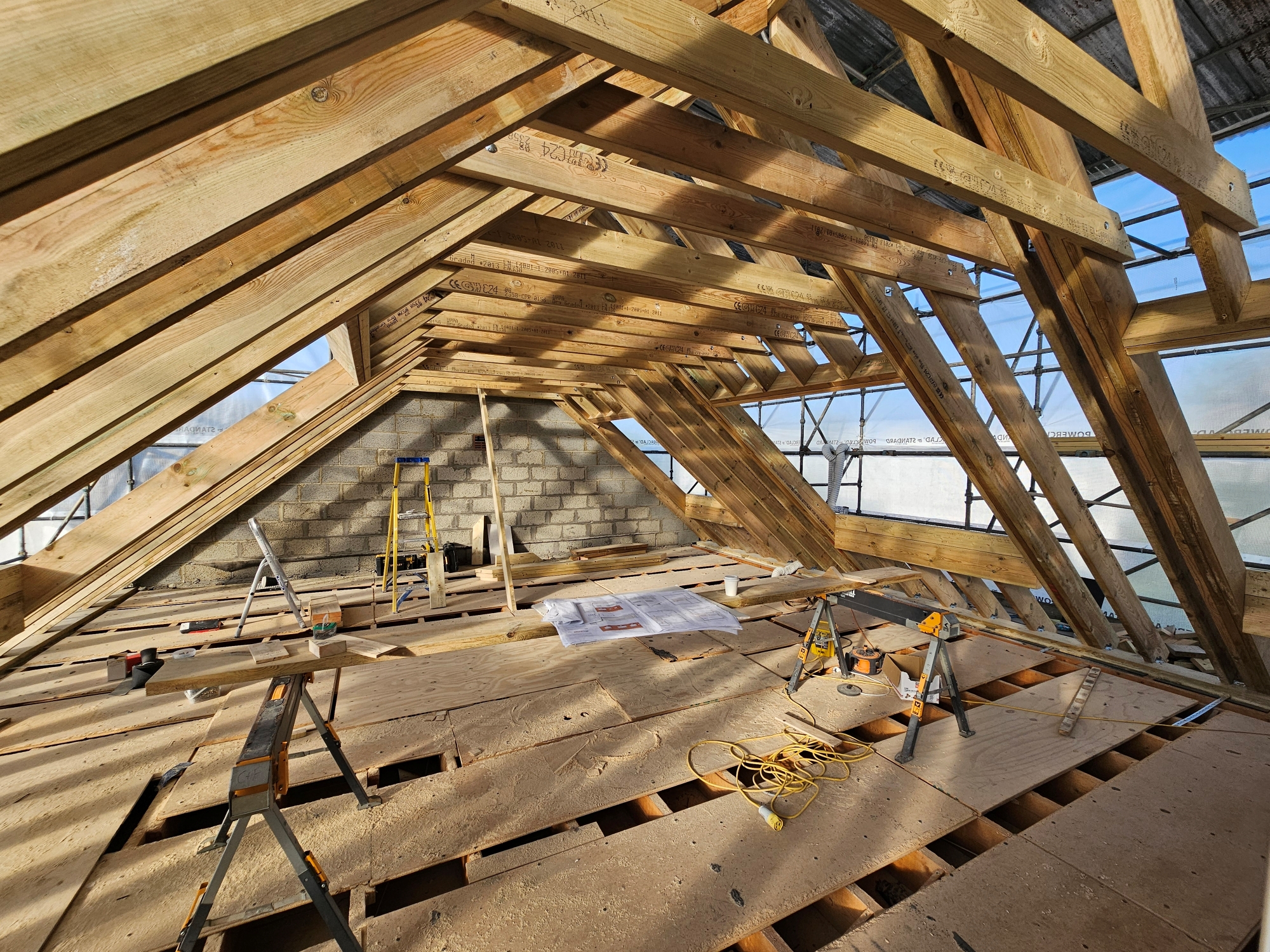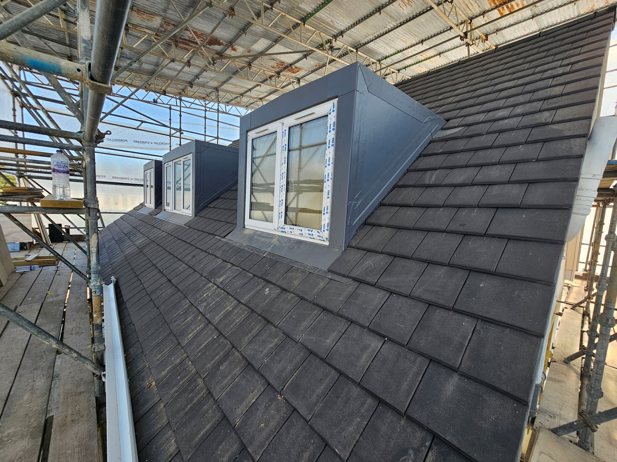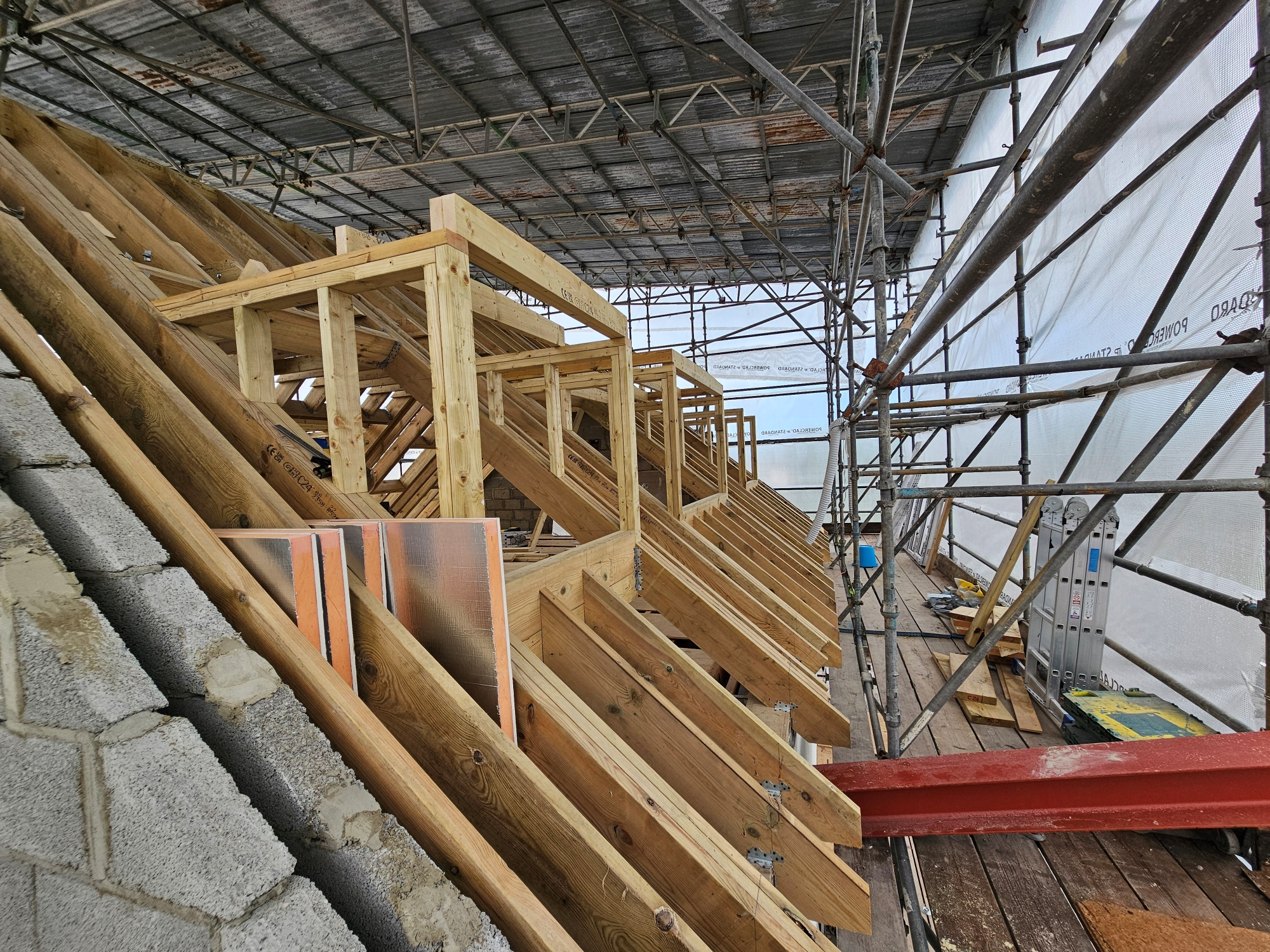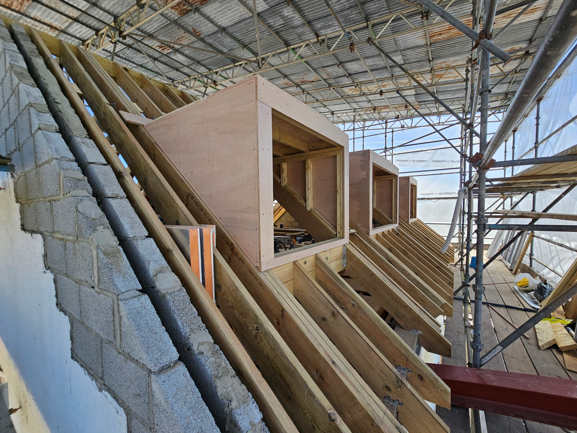 Roof construction works including timber framework, dormer construction, and Velux openings.