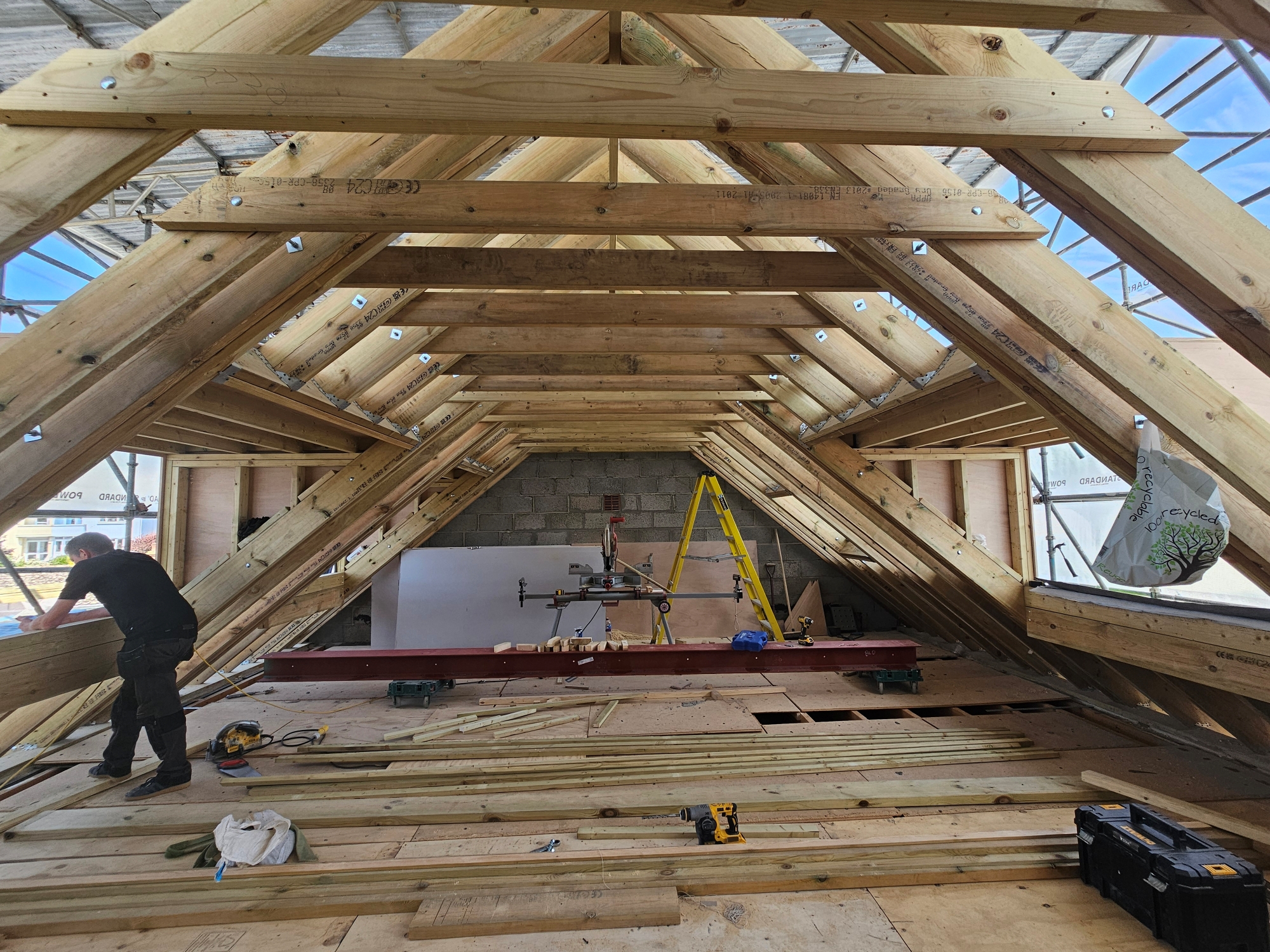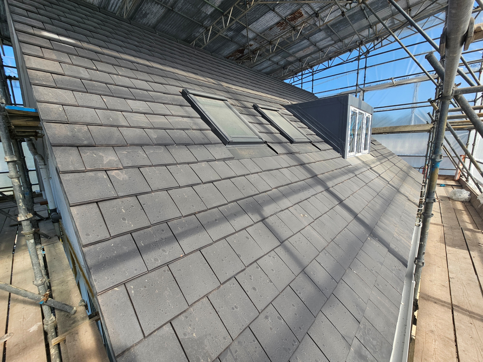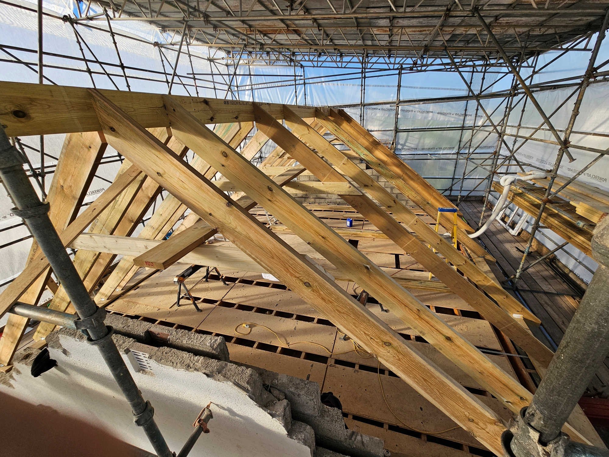 Roof construction works including timber framework, dormer construction, and Velux openings.