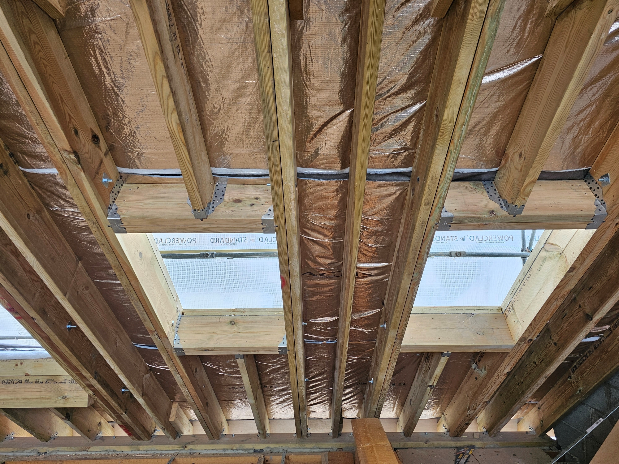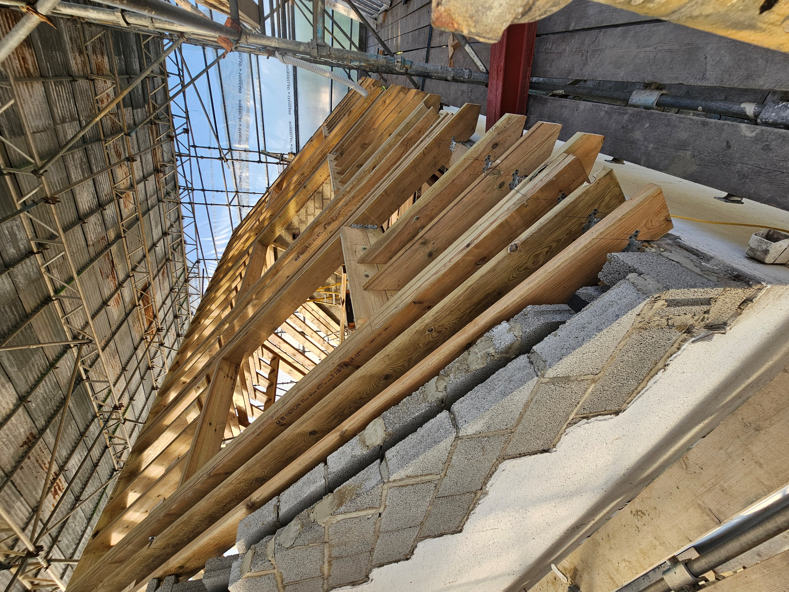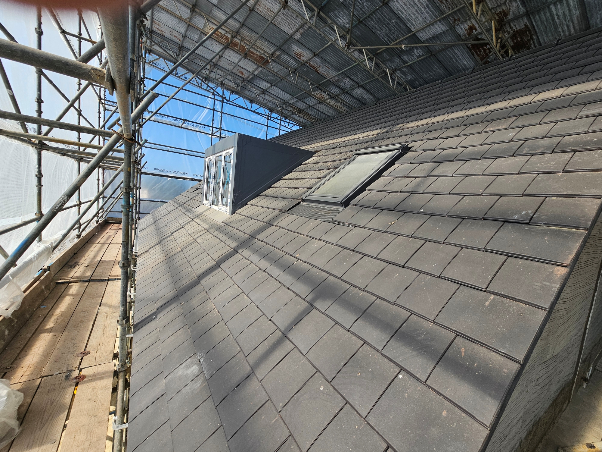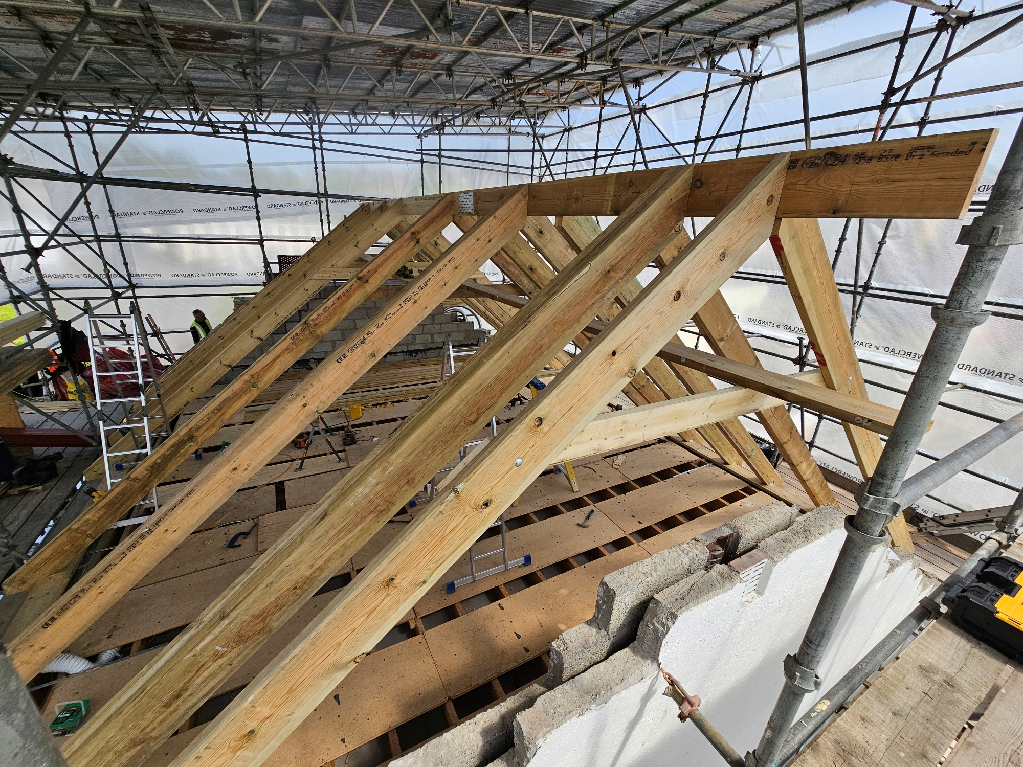 Roof construction works including timber framework, dormer construction, and Velux openings.