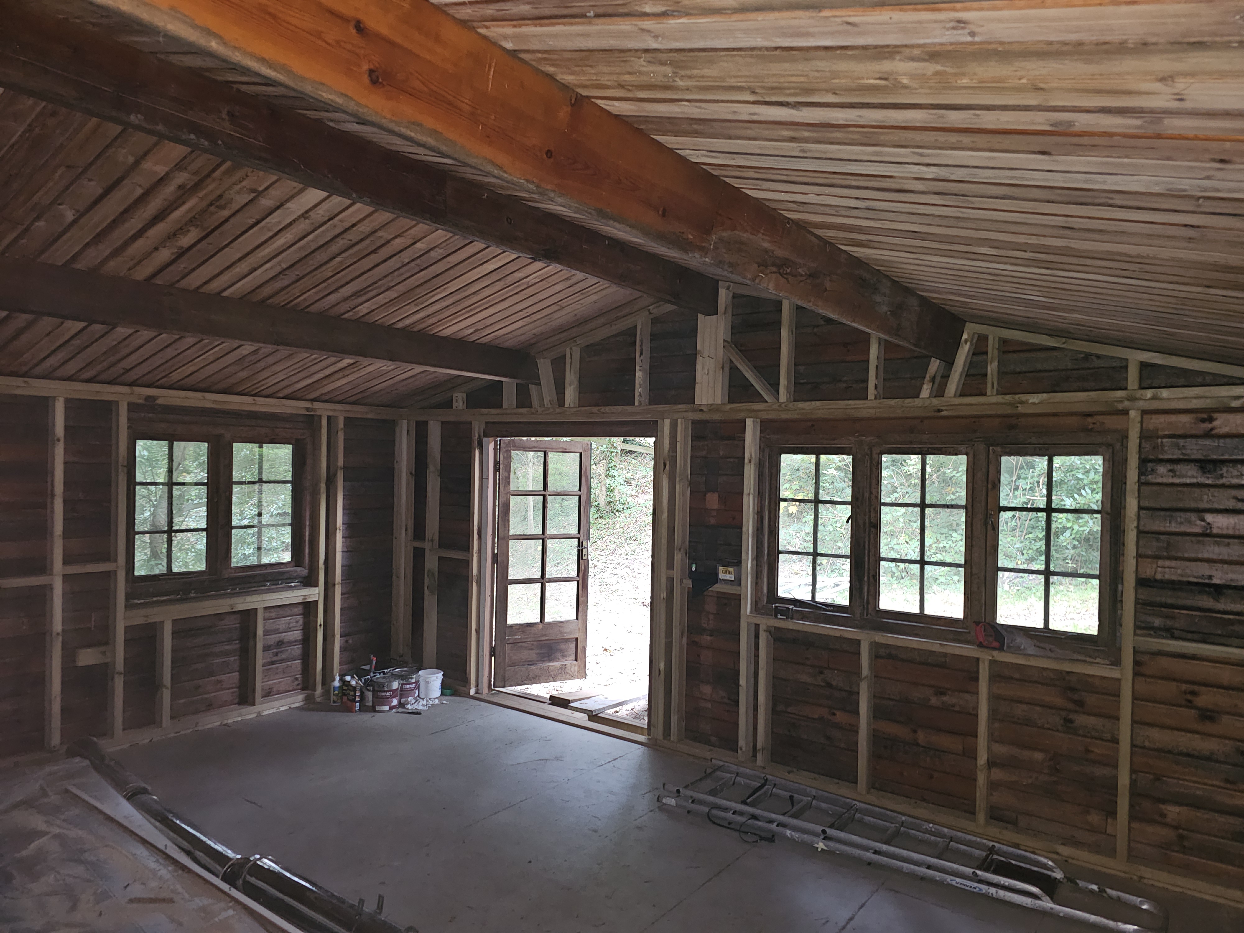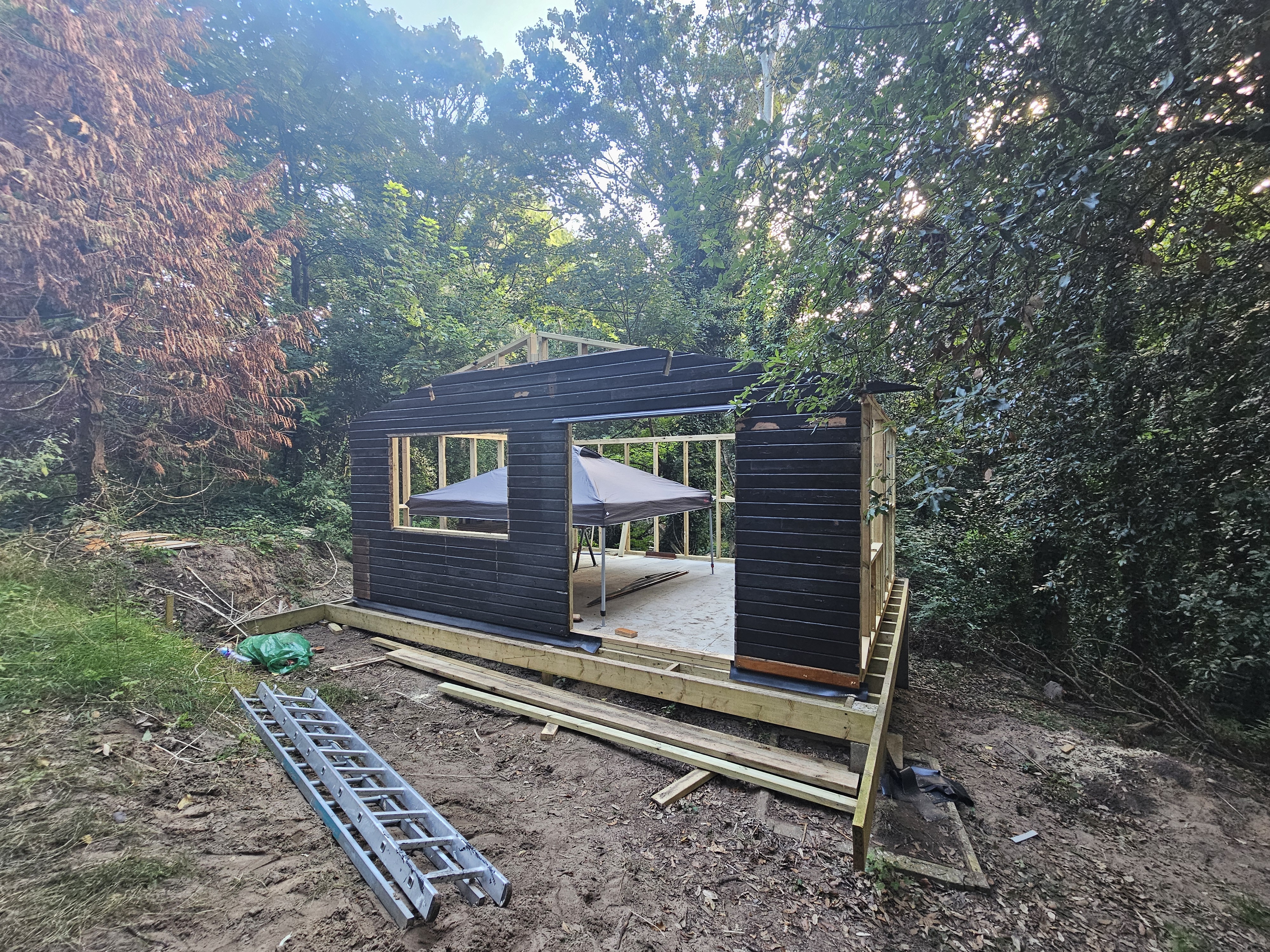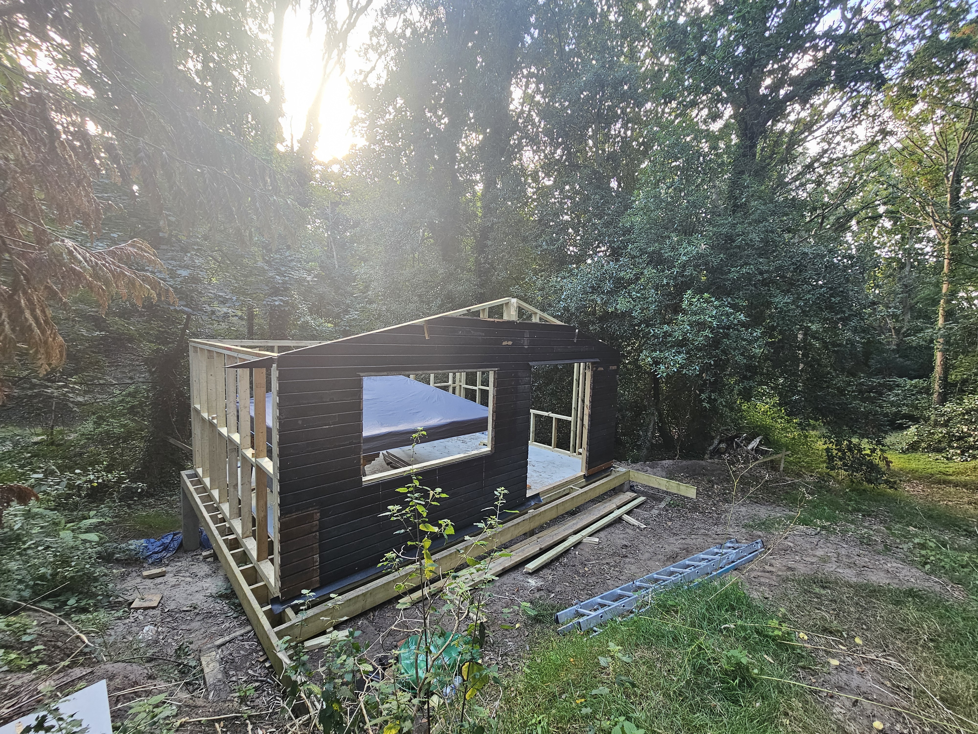 Timber cabin constructed with a new framed structure, pitched roof and full timber cladding.