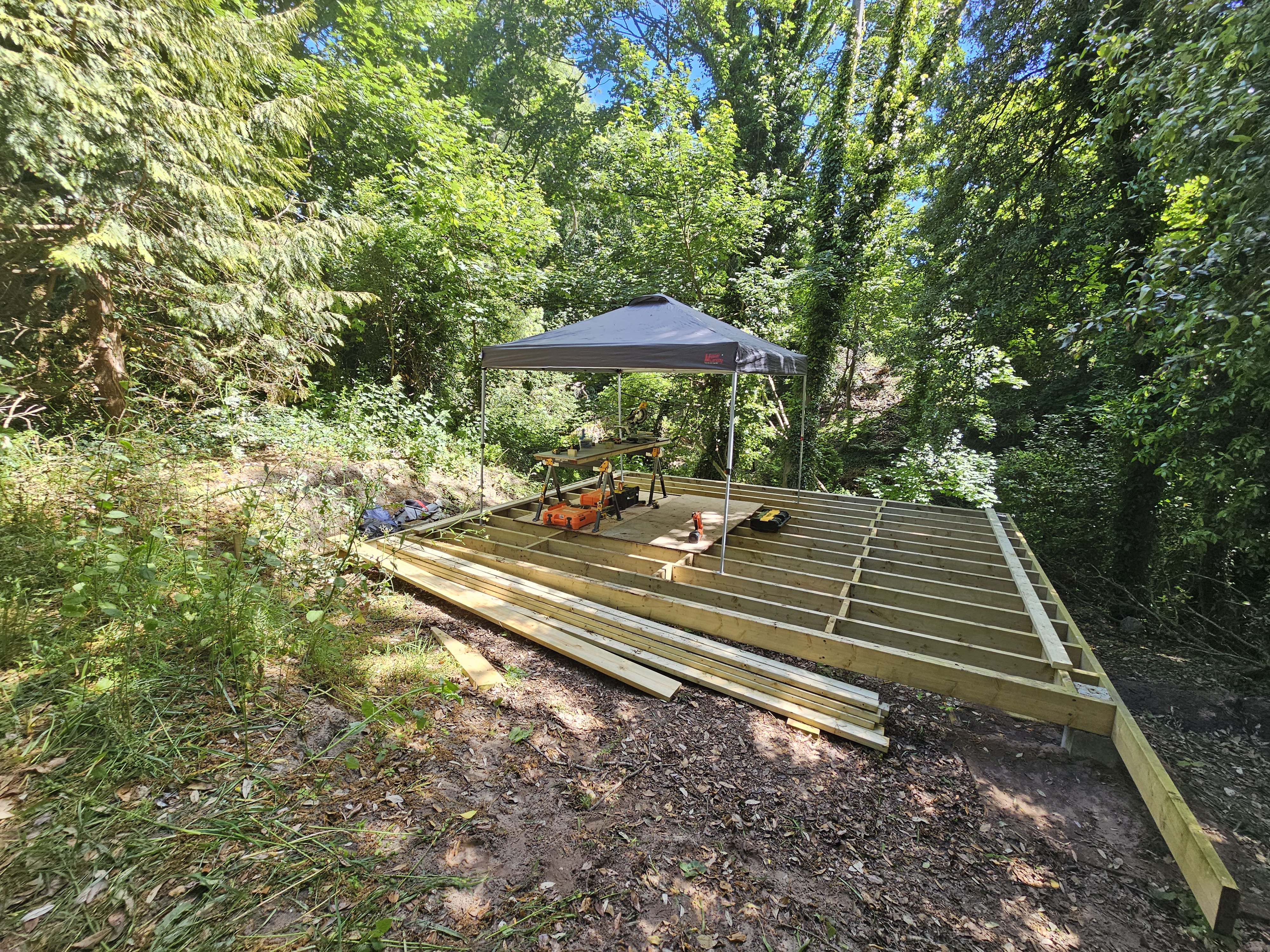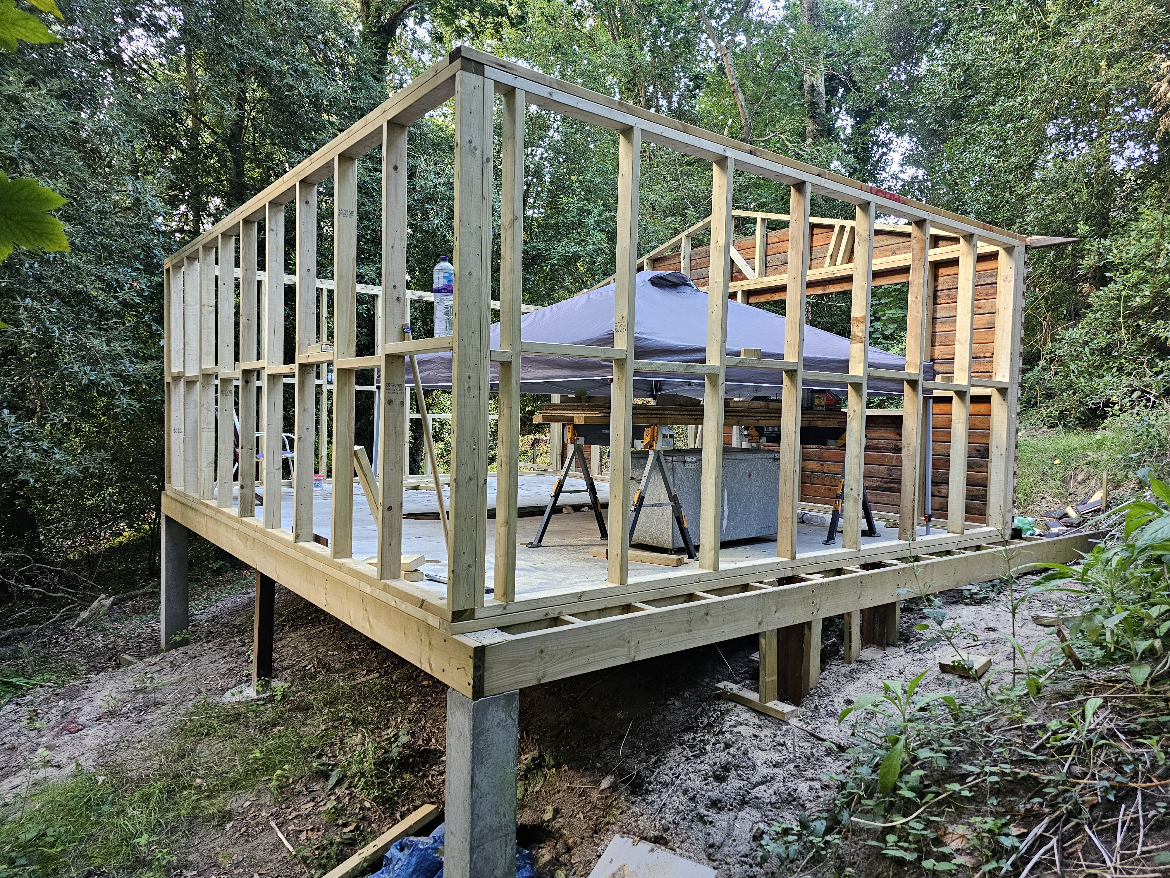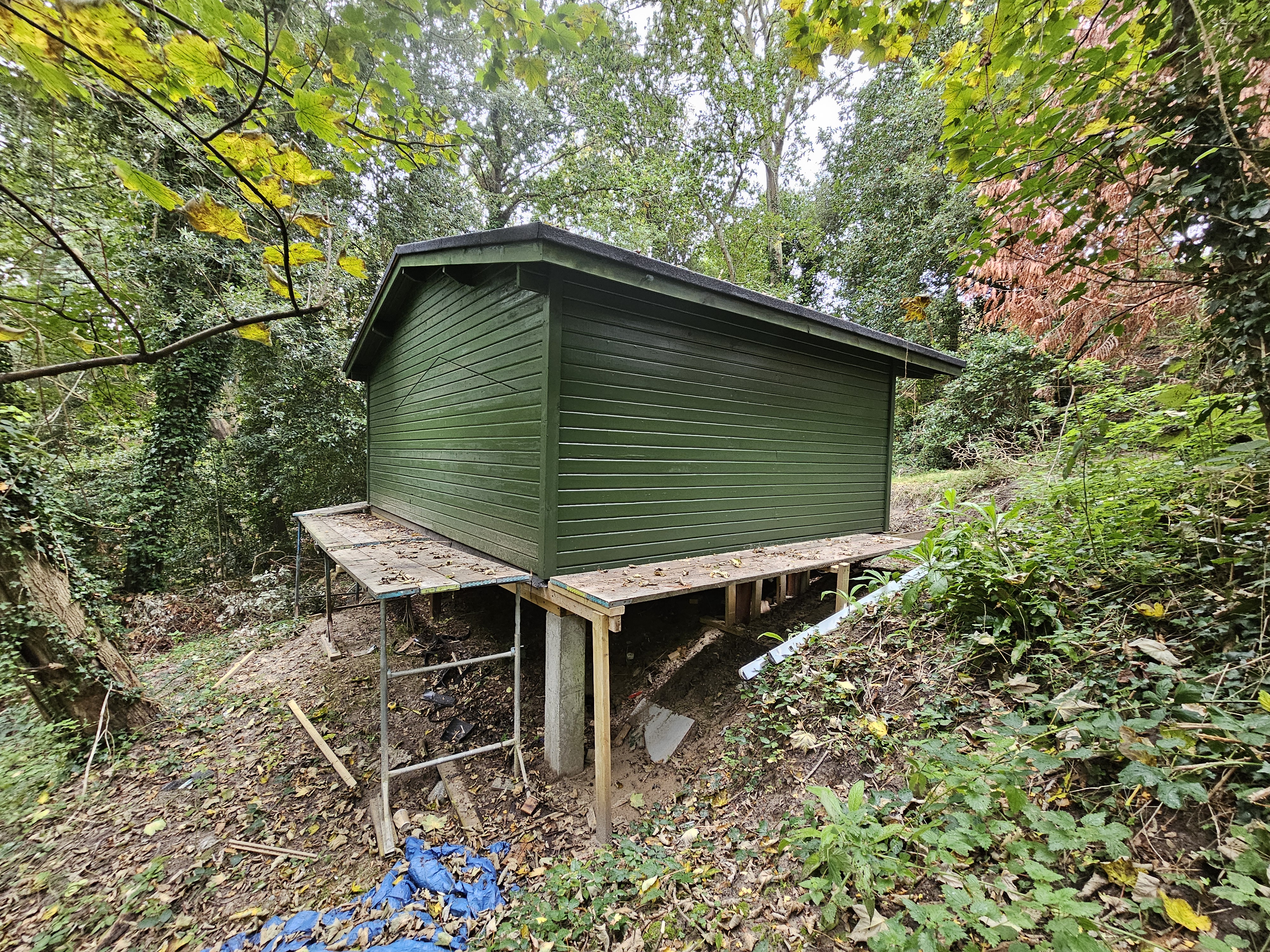Timber cabin constructed with a new framed structure, pitched roof and full timber cladding.